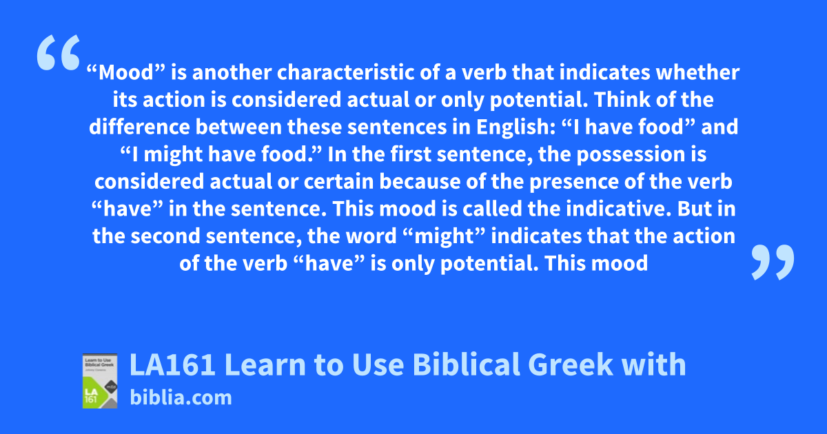“Mood” is another characteristic of a verb that indicates whether its action is considered actual or only potential. Think of the difference between these sentences in English: “I have food” and “I might have food.” In the first sentence, the possession is considered actual or certain because of the presence of the verb “have” in the sentence. This mood is called the indicative. But in the second sentence, the word “might” indicates that the action of the verb “have” is only potential. This mood