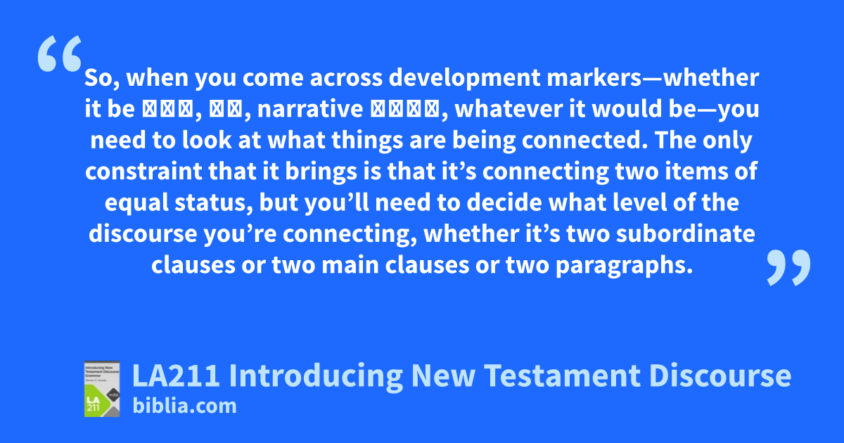 So, when you come across development markers—whether it be οὖν, δέ, narrative τότε, whatever it would be—you need to look at what things are being connected. The only constraint that it brings is that it’s connecting two items of equal status, but you’ll need to decide what level of the discourse you’re connecting, whether it’s two subordinate clauses or two main clauses or two paragraphs.