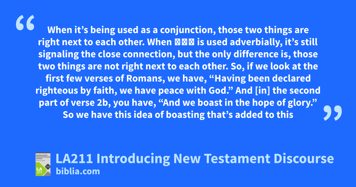 When it’s being used as a conjunction, those two things are right next to each other. When καί is used adverbially, it’s still signaling the close connection, but the only difference is, those two things are not right next to each other. So, if we look at the first few verses of Romans, we have, “Having been declared righteous by faith, we have peace with God.” And [in] the second part of verse 2b, you have, “And we boast in the hope of glory.” So we have this idea of boasting that’s added to this