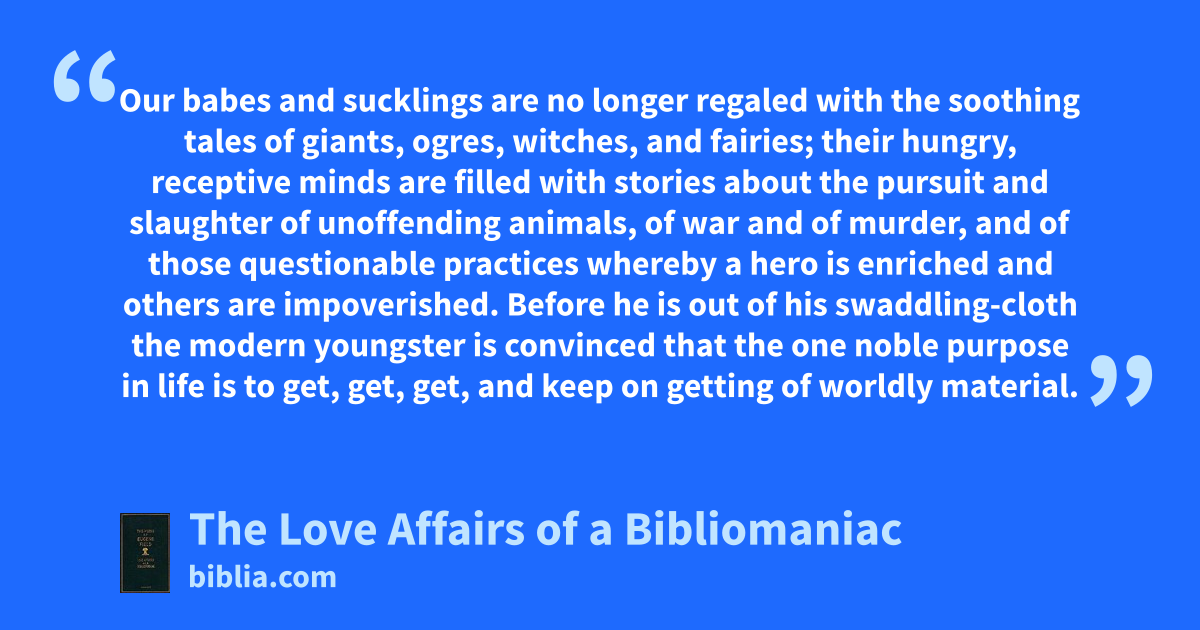 Our babes and sucklings are no longer regaled with the soothing tales of giants, ogres, witches, and fairies; their hungry, receptive minds are filled with stories about the pursuit and slaughter of unoffending animals, of war and of murder, and of those questionable practices whereby a hero is enriched and others are impoverished. Before he is out of his swaddling-cloth the modern youngster is convinced that the one noble purpose in life is to get, get, get, and keep on getting of worldly material.
