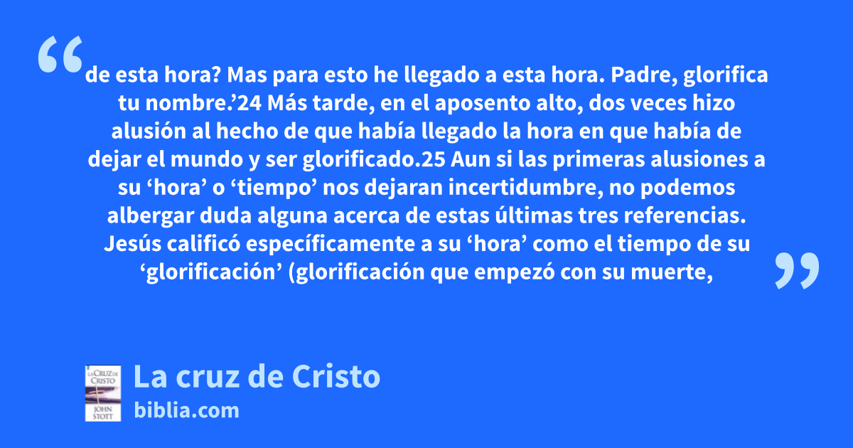 de esta hora? Mas para esto he llegado a esta hora. Padre, glorifica tu nombre.’24 Más tarde, en el aposento alto, dos veces hizo alusión al hecho de que había llegado la hora en que había de dejar el mundo y ser glorificado.25 Aun si las primeras alusiones a su ‘hora’ o ‘tiempo’ nos dejaran incertidumbre, no podemos albergar duda alguna acerca de estas últimas tres referencias. Jesús calificó específicamente a su ‘hora’ como el tiempo de su ‘glorificación’ (glorificación que empezó con su muerte,