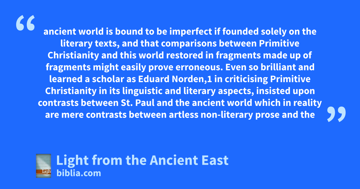Light from the Ancient East uses non-biblical, non-literary Greek and Latin ancient texts to shed light on the social, cultural and religious setting in which the NT was written. The work is intended for the general reader or non-specialist. Author Adolf Deissmann is often mentioned in the same breath as James H. Moulton, George Milligan, A. T. Robertson, and Frederick W. Danker.