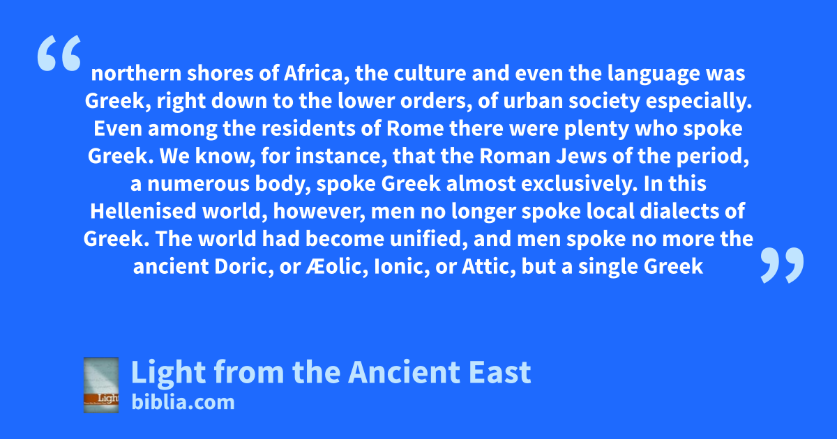 northern shores of Africa, the culture and even the language was Greek, right down to the lower orders, of urban society especially. Even among the residents of Rome there were plenty who spoke Greek. We know, for instance, that the Roman Jews of the period, a numerous body, spoke Greek almost exclusively. In this Hellenised world, however, men no longer spoke local dialects of Greek. The world had become unified, and men spoke no more the ancient Doric, or Æolic, Ionic, or Attic, but a single Greek