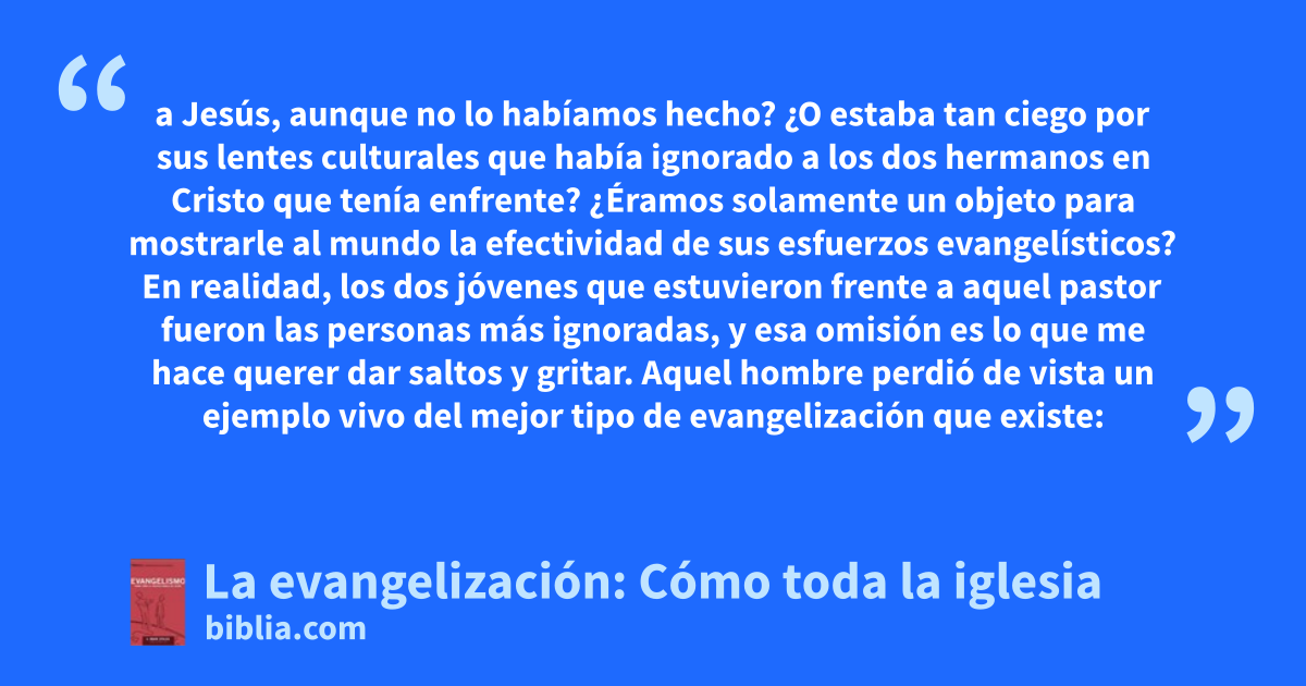 a Jesús, aunque no lo habíamos hecho? ¿O estaba tan ciego por sus lentes culturales que había ignorado a los dos hermanos en Cristo que tenía enfrente? ¿Éramos solamente un objeto para mostrarle al mundo la efectividad de sus esfuerzos evangelísticos? En realidad, los dos jóvenes que estuvieron frente a aquel pastor fueron las personas más ignoradas, y esa omisión es lo que me hace querer dar saltos y gritar. Aquel hombre perdió de vista un ejemplo vivo del mejor tipo de evangelización que existe: