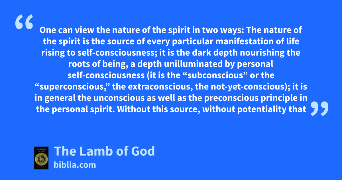 One can view the nature of the spirit in two ways: The nature of the spirit is the source of every particular manifestation of life rising to self-consciousness; it is the dark depth nourishing the roots of being, a depth unilluminated by personal self-consciousness (it is the “subconscious” or the “superconscious,” the extraconscious, the not-yet-conscious); it is in general the unconscious as well as the preconscious principle in the personal spirit. Without this source, without potentiality that