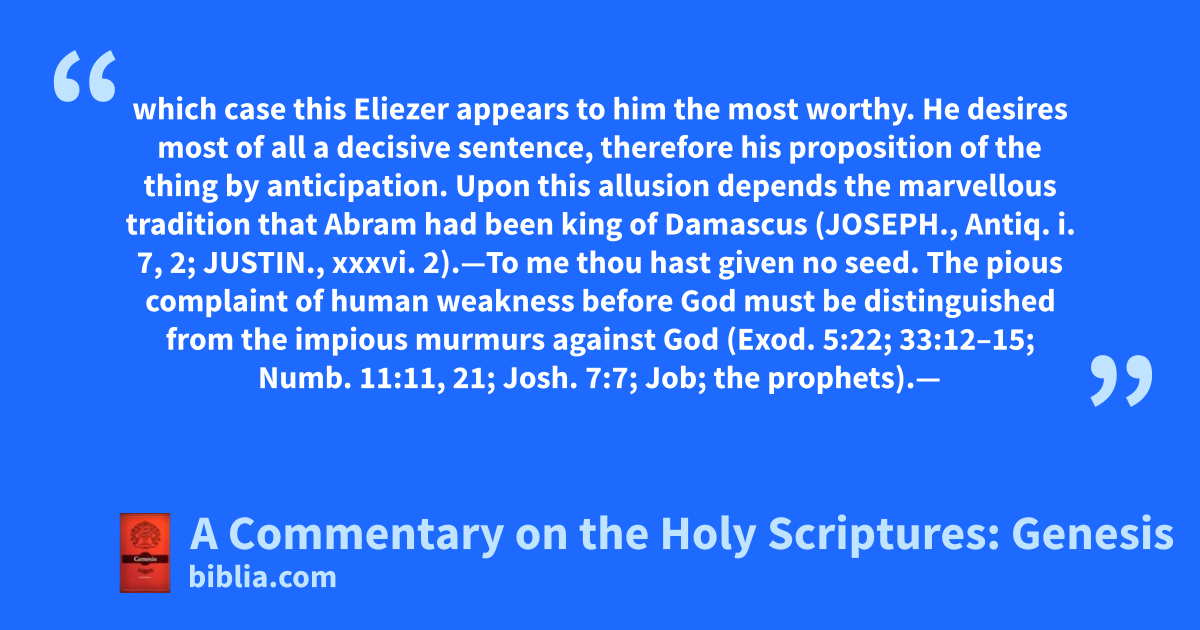 which case this Eliezer appears to him the most worthy. He desires most of all a decisive sentence, therefore his proposition of the thing by anticipation. Upon this allusion depends the marvellous tradition that Abram had been king of Damascus (JOSEPH., Antiq. i. 7, 2; JUSTIN., xxxvi. 2).—To me thou hast given no seed. The pious complaint of human weakness before God must be distinguished from the impious murmurs against God (Exod. 5:22; 33:12–15; Numb. 11:11, 21; Josh. 7:7; Job; the prophets).—