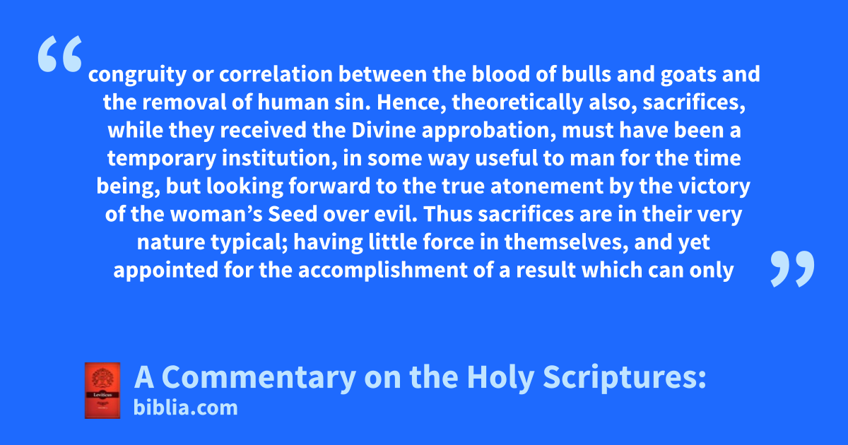 congruity or correlation between the blood of bulls and goats and the removal of human sin. Hence, theoretically also, sacrifices, while they received the Divine approbation, must have been a temporary institution, in some way useful to man for the time being, but looking forward to the true atonement by the victory of the woman’s Seed over evil. Thus sacrifices are in their very nature typical; having little force in themselves, and yet appointed for the accomplishment of a result which can only