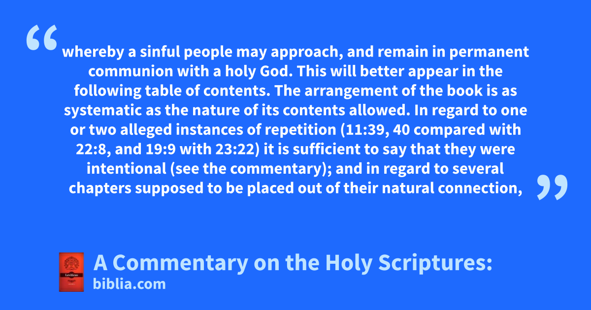 whereby a sinful people may approach, and remain in permanent communion with a holy God. This will better appear in the following table of contents. The arrangement of the book is as systematic as the nature of its contents allowed. In regard to one or two alleged instances of repetition (11:39, 40 compared with 22:8, and 19:9 with 23:22) it is sufficient to say that they were intentional (see the commentary); and in regard to several chapters supposed to be placed out of their natural connection,