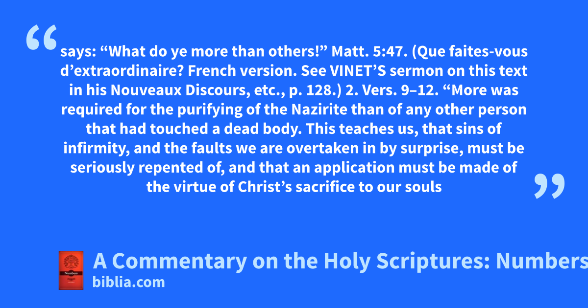 says: “What do ye more than others!” Matt. 5:47. (Que faites-vous d’extraordinaire? French version. See VINET’S sermon on this text in his Nouveaux Discours, etc., p. 128.) 2. Vers. 9–12. “More was required for the purifying of the Nazirite than of any other person that had touched a dead body. This teaches us, that sins of infirmity, and the faults we are overtaken in by surprise, must be seriously repented of, and that an application must be made of the virtue of Christ’s sacrifice to our souls