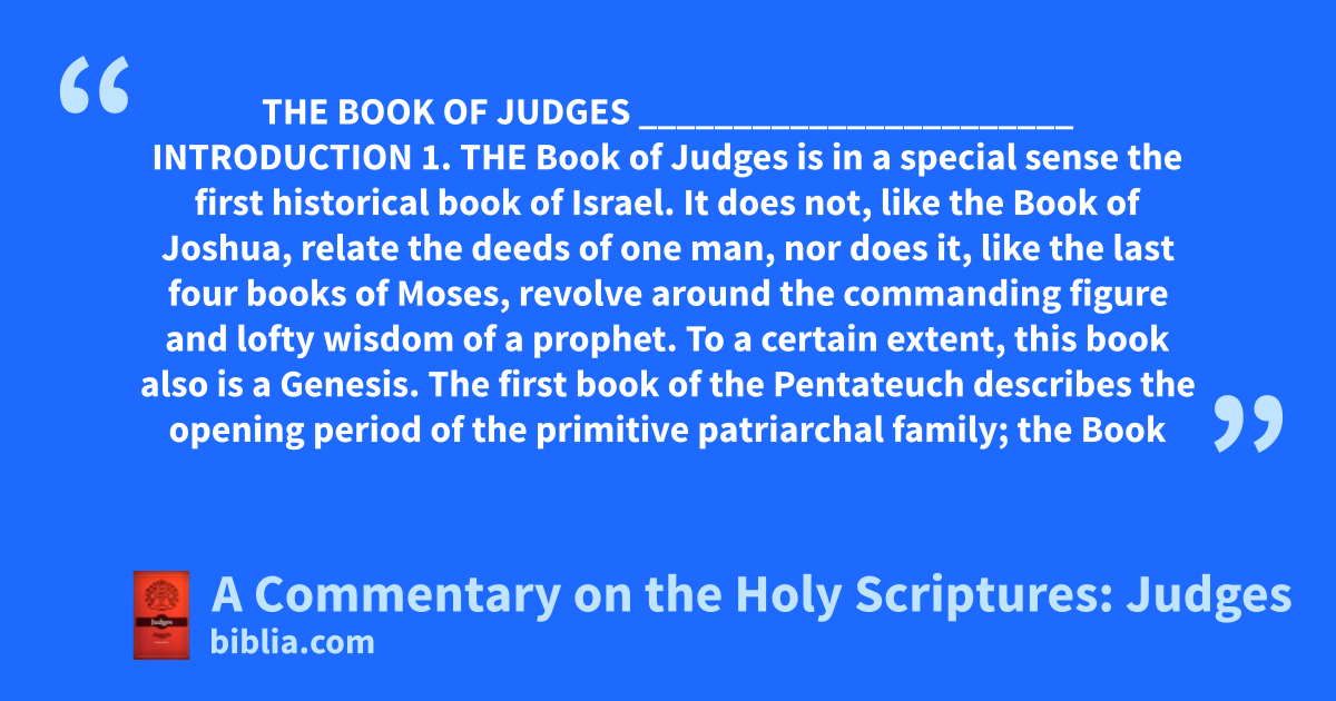 THE BOOK OF JUDGES _______________________ INTRODUCTION 1. THE Book of Judges is in a special sense the first historical book of Israel. It does not, like the Book of Joshua, relate the deeds of one man, nor does it, like the last four books of Moses, revolve around the commanding figure and lofty wisdom of a prophet. To a certain extent, this book also is a Genesis. The first book of the Pentateuch describes the opening period of the primitive patriarchal family; the Book
