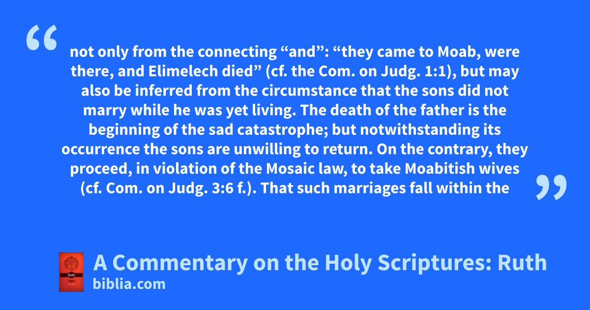 not only from the connecting “and”: “they came to Moab, were there, and Elimelech died” (cf. the Com. on Judg. 1:1), but may also be inferred from the circumstance that the sons did not marry while he was yet living. The death of the father is the beginning of the sad catastrophe; but notwithstanding its occurrence the sons are unwilling to return. On the contrary, they proceed, in violation of the Mosaic law, to take Moabitish wives (cf. Com. on Judg. 3:6 f.). That such marriages fall within the