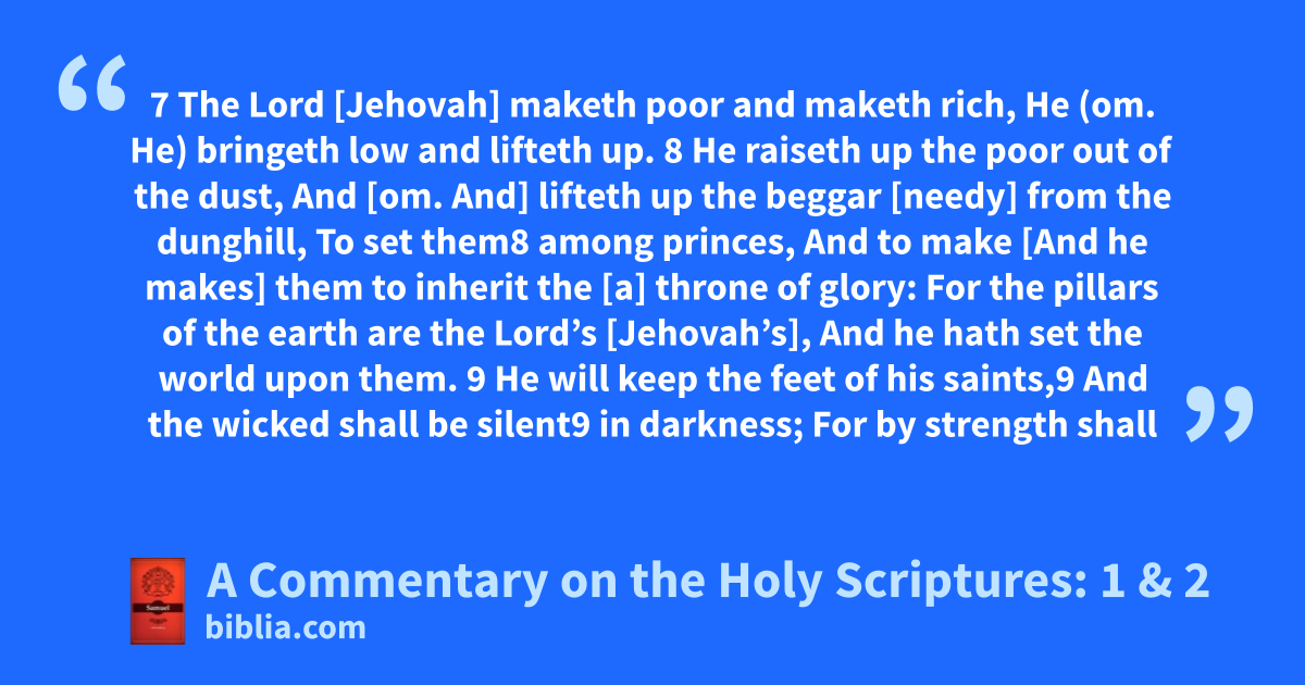 7 The Lord [Jehovah] maketh poor and maketh rich, He (om. He) bringeth low and lifteth up. 8 He raiseth up the poor out of the dust, And [om. And] lifteth up the beggar [needy] from the dunghill, To set them8 among princes, And to make [And he makes] them to inherit the [a] throne of glory: For the pillars of the earth are the Lord’s [Jehovah’s], And he hath set the world upon them. 9 He will keep the feet of his saints,9 And the wicked shall be silent9 in darkness; For by strength shall