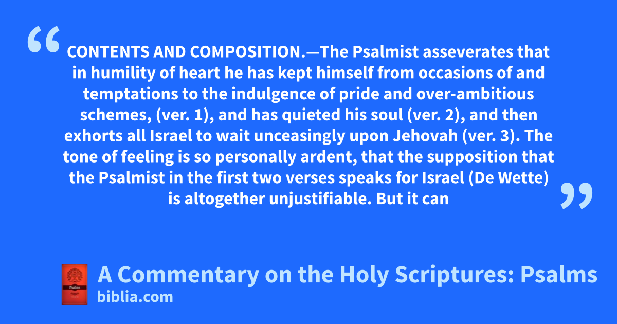 CONTENTS AND COMPOSITION.—The Psalmist asseverates that in humility of heart he has kept himself from occasions of and temptations to the indulgence of pride and over-ambitious schemes, (ver. 1), and has quieted his soul (ver. 2), and then exhorts all Israel to wait unceasingly upon Jehovah (ver. 3). The tone of feeling is so personally ardent, that the supposition that the Psalmist in the first two verses speaks for Israel (De Wette) is altogether unjustifiable. But it can