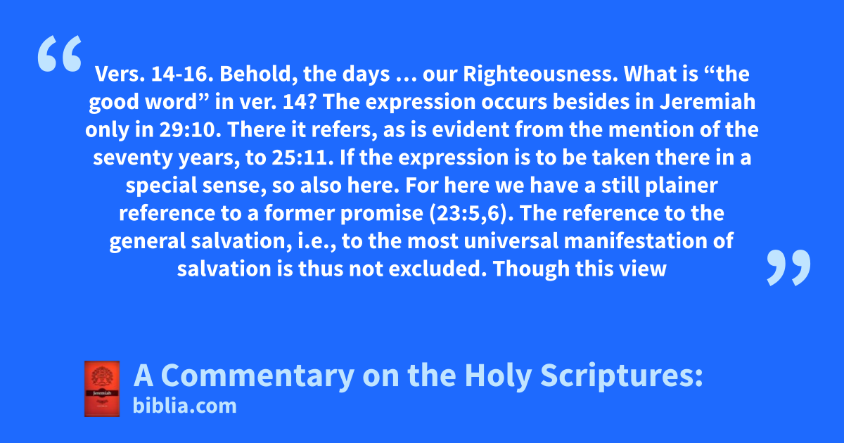 Vers. 14-16. Behold, the days … our Righteousness. What is “the good word” in ver. 14? The expression occurs besides in Jeremiah only in 29:10. There it refers, as is evident from the mention of the seventy years, to 25:11. If the expression is to be taken there in a special sense, so also here. For here we have a still plainer reference to a former promise (23:5,6). The reference to the general salvation, i.e., to the most universal manifestation of salvation is thus not excluded. Though this view