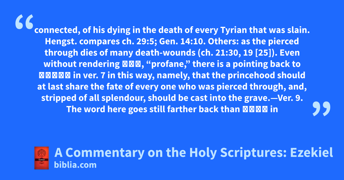 connected, of his dying in the death of every Tyrian that was slain. Hengst. compares ch. 29:5; Gen. 14:10. Others: as the pierced through dies of many death-wounds (ch. 21:30, 19 [25]). Even without rendering חלל, “profane,” there is a pointing back to וחללי in ver. 7 in this way, namely, that the princehood should at last share the fate of every one who was pierced through, and, stripped of all splendour, should be cast into the grave.—Ver. 9. The word here goes still farther back than ומתה in