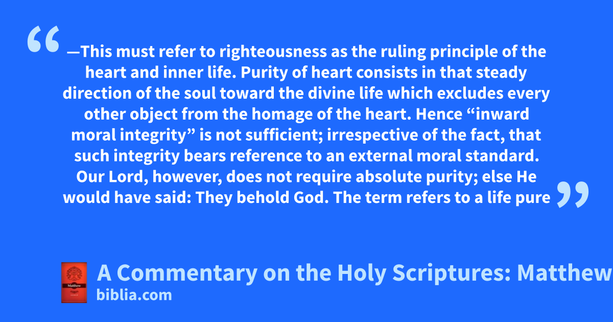 —This must refer to righteousness as the ruling principle of the heart and inner life. Purity of heart consists in that steady direction of the soul toward the divine life which excludes every other object from the homage of the heart. Hence “inward moral integrity” is not sufficient; irrespective of the fact, that such integrity bears reference to an external moral standard. Our Lord, however, does not require absolute purity; else He would have said: They behold God. The term refers to a life pure