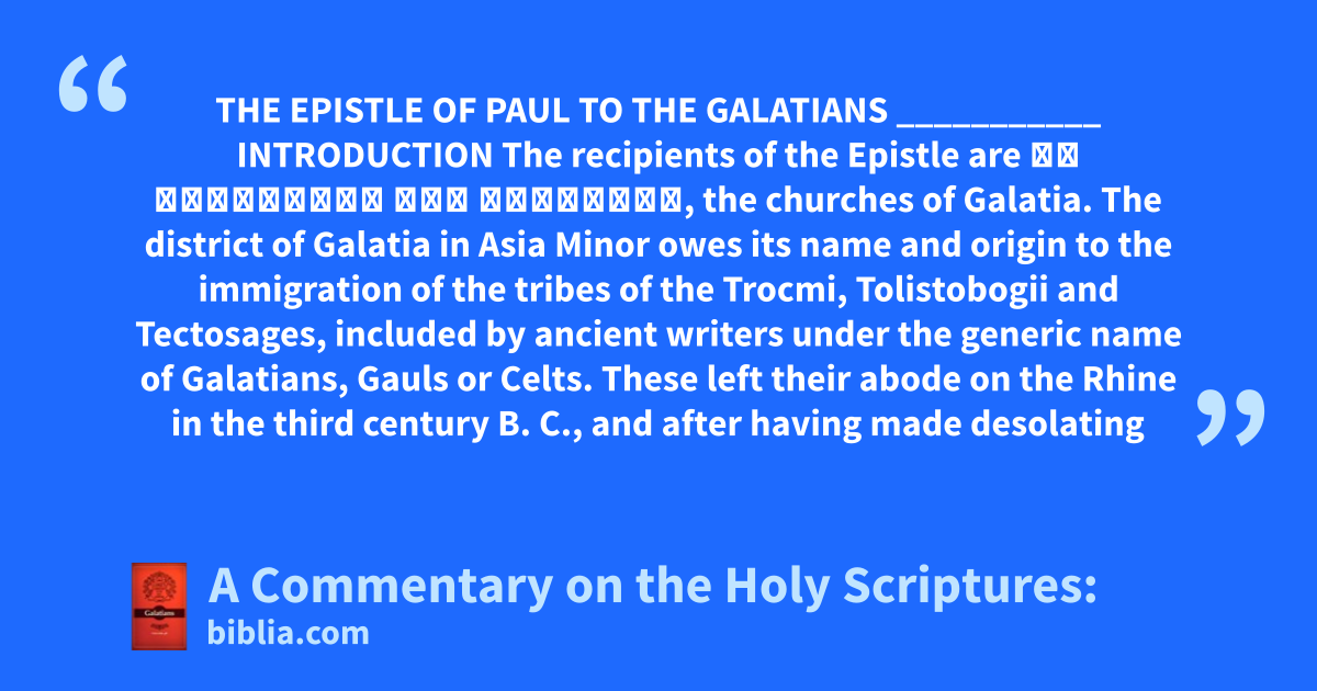 THE EPISTLE OF PAUL TO THE GALATIANS ___________ INTRODUCTION The recipients of the Epistle are αἱ ἐκκλησίαι τῆς Γαλατίας, the churches of Galatia. The district of Galatia in Asia Minor owes its name and origin to the immigration of the tribes of the Trocmi, Tolistobogii and Tectosages, included by ancient writers under the generic name of Galatians, Gauls or Celts. These left their abode on the Rhine in the third century B. C., and after having made desolating