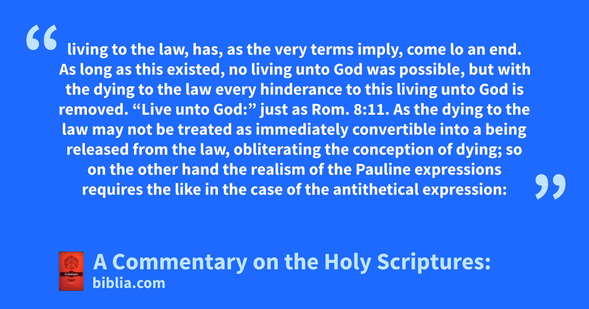living to the law, has, as the very terms imply, come lo an end. As long as this existed, no living unto God was possible, but with the dying to the law every hinderance to this living unto God is removed. “Live unto God:” just as Rom. 8:11. As the dying to the law may not be treated as immediately convertible into a being released from the law, obliterating the conception of dying; so on the other hand the realism of the Pauline expressions requires the like in the case of the antithetical expression: