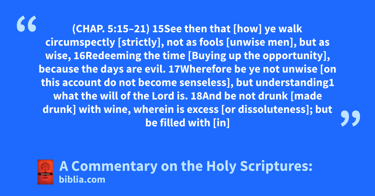 (CHAP. 5:15–21) 15See then that [how] ye walk circumspectly [strictly], not as fools [unwise men], but as wise, 16Redeeming the time [Buying up the opportunity], because the days are evil. 17Wherefore be ye not unwise [on this account do not become senseless], but understanding1 what the will of the Lord is. 18And be not drunk [made drunk] with wine, wherein is excess [or dissoluteness]; but be filled with [in]