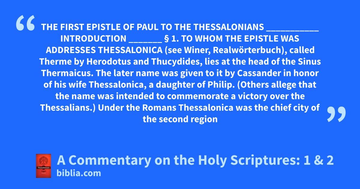 THE FIRST EPISTLE OF PAUL TO THE THESSALONIANS ___________ INTRODUCTION _______ § 1. TO WHOM THE EPISTLE WAS ADDRESSES THESSALONICA (see Winer, Realwörterbuch), called Therme by Herodotus and Thucydides, lies at the head of the Sinus Thermaicus. The later name was given to it by Cassander in honor of his wife Thessalonica, a daughter of Philip. (Others allege that the name was intended to commemorate a victory over the Thessalians.) Under the Romans Thessalonica was the chief city of the second region