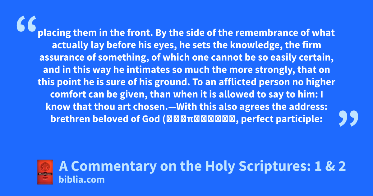 placing them in the front. By the side of the remembrance of what actually lay before his eyes, he sets the knowledge, the firm assurance of something, of which one cannot be so easily certain, and in this way he intimates so much the more strongly, that on this point he is sure of his ground. To an afflicted person no higher comfort can be given, than when it is allowed to say to him: I know that thou art chosen.—With this also agrees the address: brethren beloved of God (ἠγαπημένοι, perfect participle: