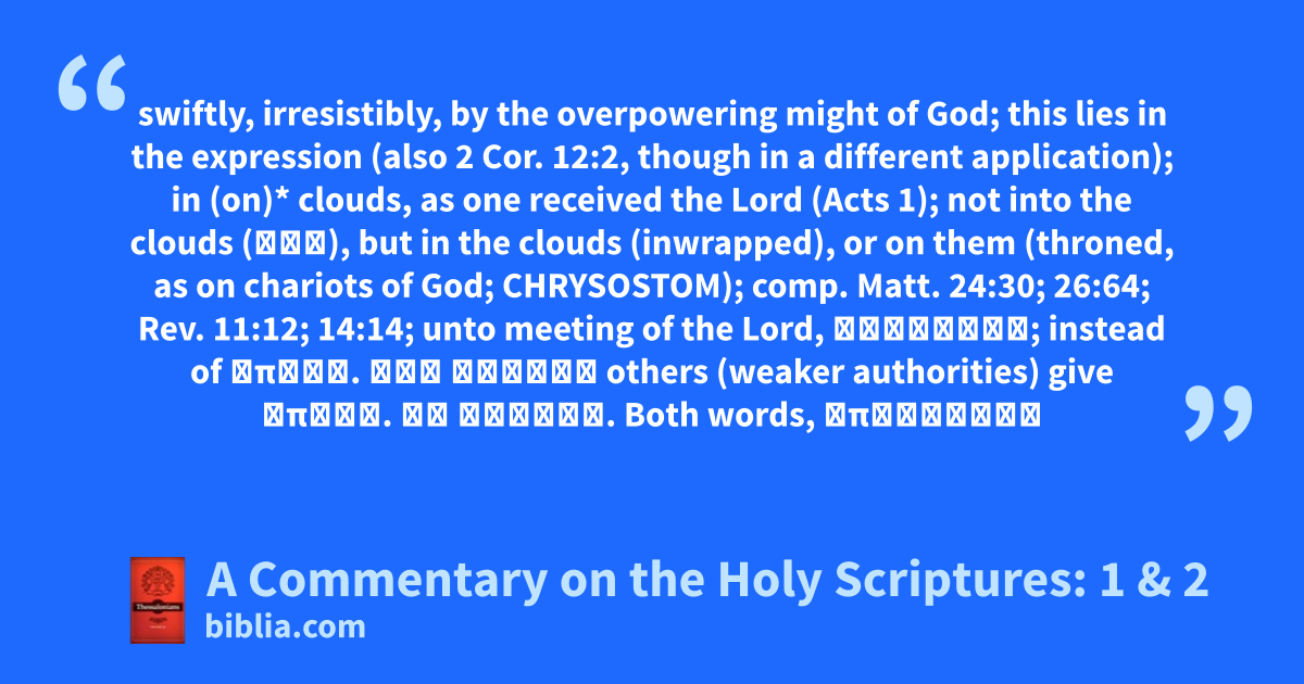 swiftly, irresistibly, by the overpowering might of God; this lies in the expression (also 2 Cor. 12:2, though in a different application); in (on)* clouds, as one received the Lord (Acts 1); not into the clouds (εἰς), but in the clouds (inwrapped), or on them (throned, as on chariots of God; CHRYSOSTOM); comp. Matt. 24:30; 26:64; Rev. 11:12; 14:14; unto meeting of the Lord, לִקְרַאת; instead of ἀπάντ. τοῦ κυρίου others (weaker authorities) give ὑπάντ. τῷ Χριστῷ. Both words, ἀπάντησις