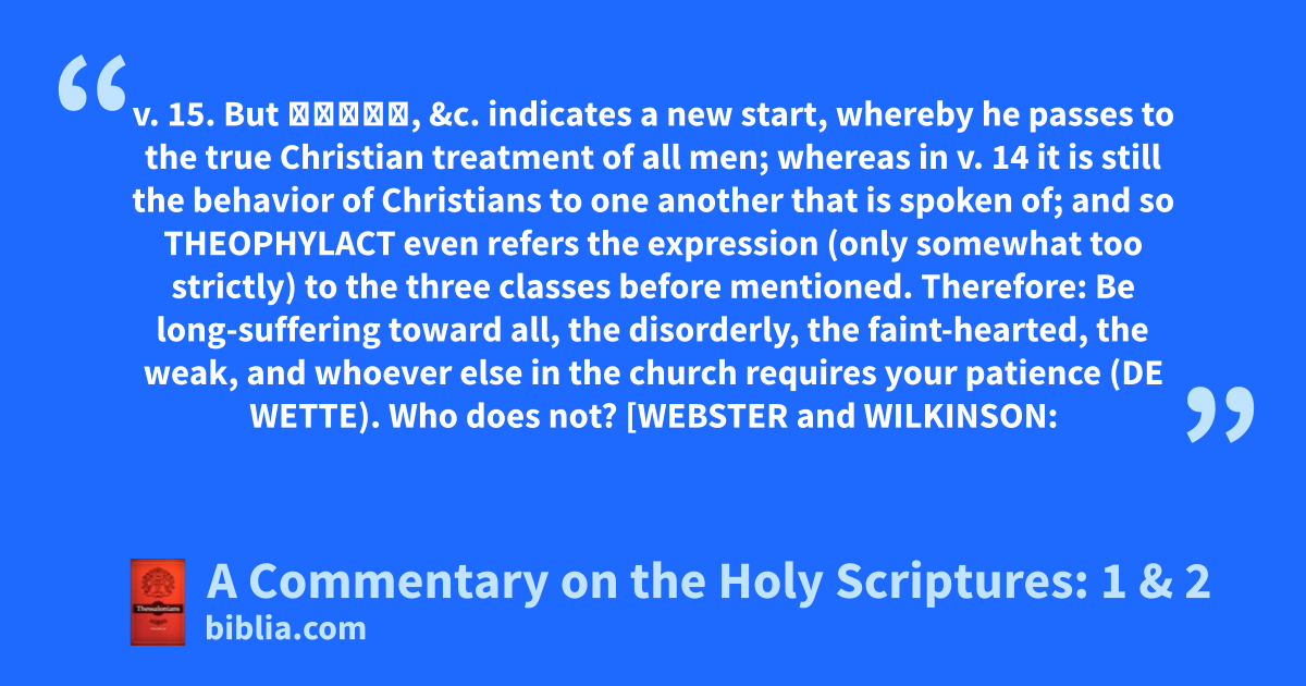 v. 15. But ὁρᾶτε, &c. indicates a new start, whereby he passes to the true Christian treatment of all men; whereas in v. 14 it is still the behavior of Christians to one another that is spoken of; and so THEOPHYLACT even refers the expression (only somewhat too strictly) to the three classes before mentioned. Therefore: Be long-suffering toward all, the disorderly, the faint-hearted, the weak, and whoever else in the church requires your patience (DE WETTE). Who does not? [WEBSTER and WILKINSON: