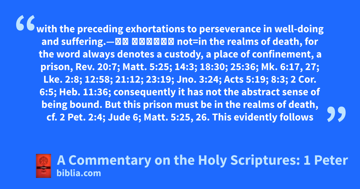 with the preceding exhortations to perseverance in well-doing and suffering.—ἐν φυλακᾖ not=in the realms of death, for the word always denotes a custody, a place of confinement, a prison, Rev. 20:7; Matt. 5:25; 14:3; 18:30; 25:36; Mk. 6:17, 27; Lke. 2:8; 12:58; 21:12; 23:19; Jno. 3:24; Acts 5:19; 8:3; 2 Cor. 6:5; Heb. 11:36; consequently it has not the abstract sense of being bound. But this prison must be in the realms of death, cf. 2 Pet. 2:4; Jude 6; Matt. 5:25, 26. This evidently follows