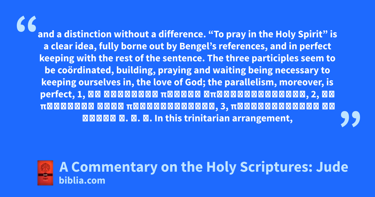 and a distinction without a difference. “To pray in the Holy Spirit” is a clear idea, fully borne out by Bengel’s references, and in perfect keeping with the rest of the sentence. The three participles seem to be coördinated, building, praying and waiting being necessary to keeping ourselves in, the love of God; the parallelism, moreover, is perfect, 1, τῇ ἁγιωτάτῃ πίστει ἐποικοδομοῦντες, 2, ἐν πνεύματι ἁγίῳ προσευχόμενοι, 3, προσδεχόμενοι τὸ ἔλεος κ. τ. λ. In this trinitarian arrangement,