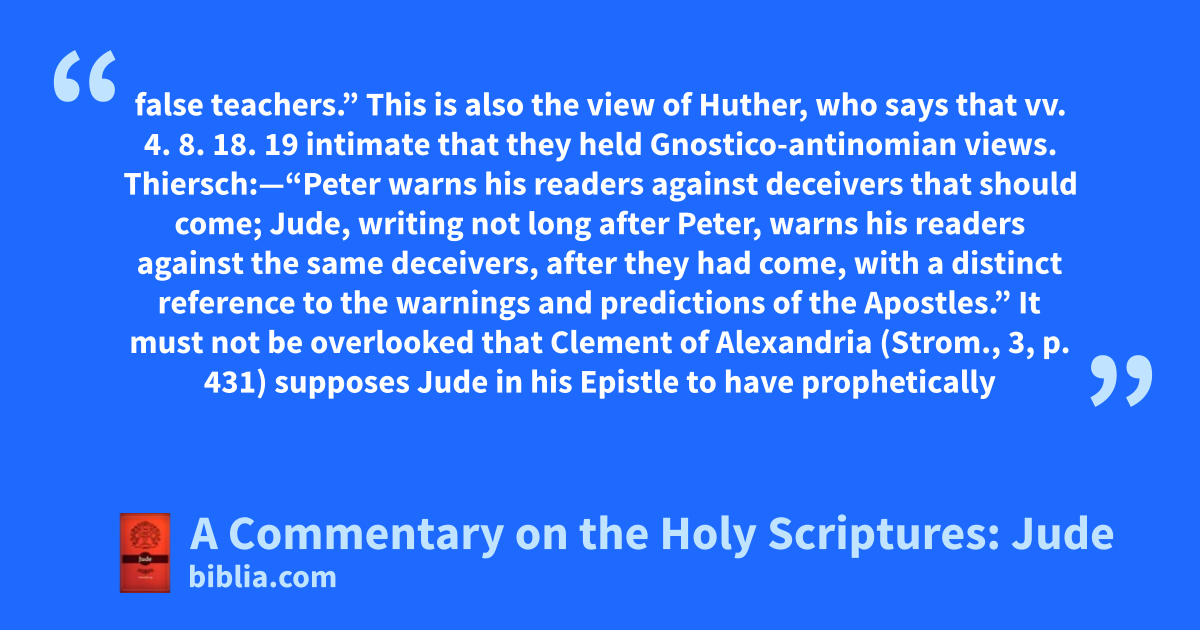 false teachers.” This is also the view of Huther, who says that vv. 4. 8. 18. 19 intimate that they held Gnostico-antinomian views. Thiersch:—“Peter warns his readers against deceivers that should come; Jude, writing not long after Peter, warns his readers against the same deceivers, after they had come, with a distinct reference to the warnings and predictions of the Apostles.” It must not be overlooked that Clement of Alexandria (Strom., 3, p. 431) supposes Jude in his Epistle to have prophetically