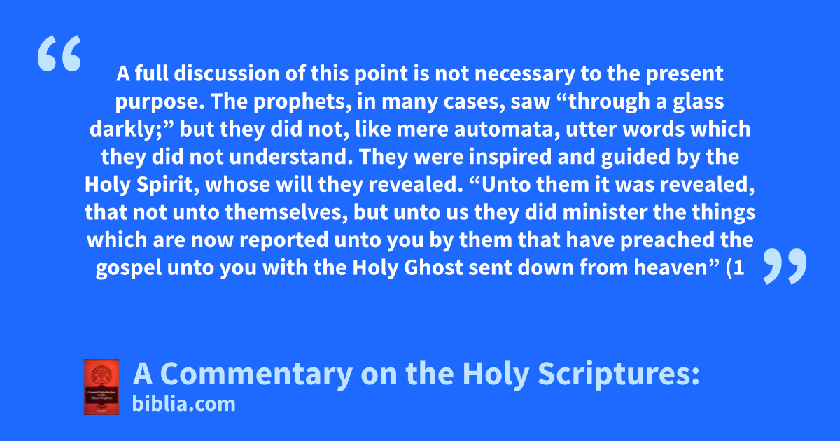 A full discussion of this point is not necessary to the present purpose. The prophets, in many cases, saw “through a glass darkly;” but they did not, like mere automata, utter words which they did not understand. They were inspired and guided by the Holy Spirit, whose will they revealed. “Unto them it was revealed, that not unto themselves, but unto us they did minister the things which are now reported unto you by them that have preached the gospel unto you with the Holy Ghost sent down from heaven” (1