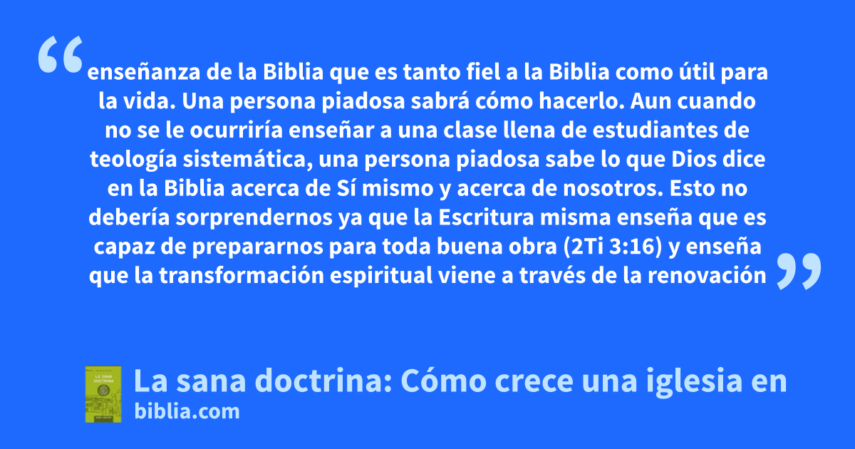 enseñanza de la Biblia que es tanto fiel a la Biblia como útil para la vida. Una persona piadosa sabrá cómo hacerlo. Aun cuando no se le ocurriría enseñar a una clase llena de estudiantes de teología sistemática, una persona piadosa sabe lo que Dios dice en la Biblia acerca de Sí mismo y acerca de nosotros. Esto no debería sorprendernos ya que la Escritura misma enseña que es capaz de prepararnos para toda buena obra (2Ti 3:16) y enseña que la transformación espiritual viene a través de la renovación
