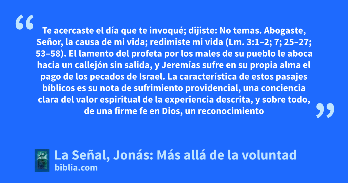 Te acercaste el día que te invoqué; dijiste: No temas. Abogaste, Señor, la causa de mi vida; redimiste mi vida (Lm. 3:1–2; 7; 25–27; 53–58). El lamento del profeta por los males de su pueblo le aboca hacia un callejón sin salida, y Jeremías sufre en su propia alma el pago de los pecados de Israel. La característica de estos pasajes bíblicos es su nota de sufrimiento providencial, una conciencia clara del valor espiritual de la experiencia descrita, y sobre todo, de una firme fe en Dios, un reconocimiento
