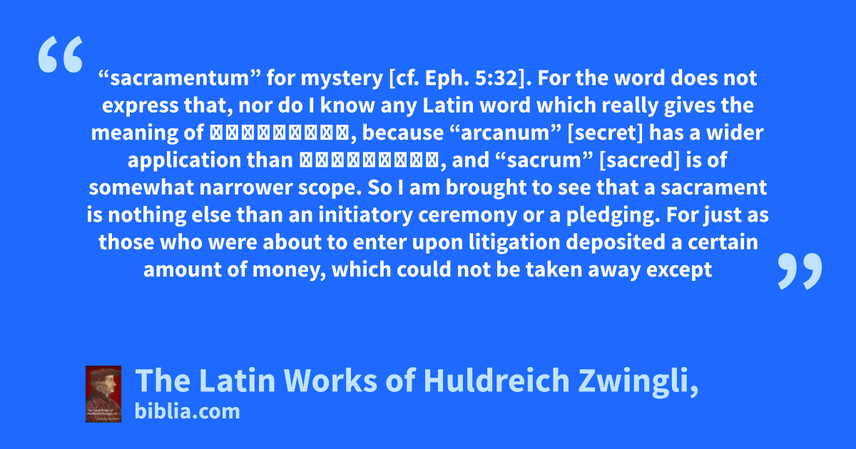 “sacramentum” for mystery [cf. Eph. 5:32]. For the word does not express that, nor do I know any Latin word which really gives the meaning of μυστήριον, because “arcanum” [secret] has a wider application than μυστήριον, and “sacrum” [sacred] is of somewhat narrower scope. So I am brought to see that a sacrament is nothing else than an initiatory ceremony or a pledging. For just as those who were about to enter upon litigation deposited a certain amount of money, which could not be taken away except