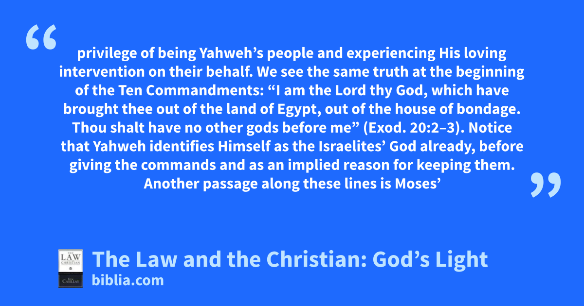 privilege of being Yahweh’s people and experiencing His loving intervention on their behalf. We see the same truth at the beginning of the Ten Commandments: “I am the Lord thy God, which have brought thee out of the land of Egypt, out of the house of bondage. Thou shalt have no other gods before me” (Exod. 20:2–3). Notice that Yahweh identifies Himself as the Israelites’ God already, before giving the commands and as an implied reason for keeping them. Another passage along these lines is Moses’