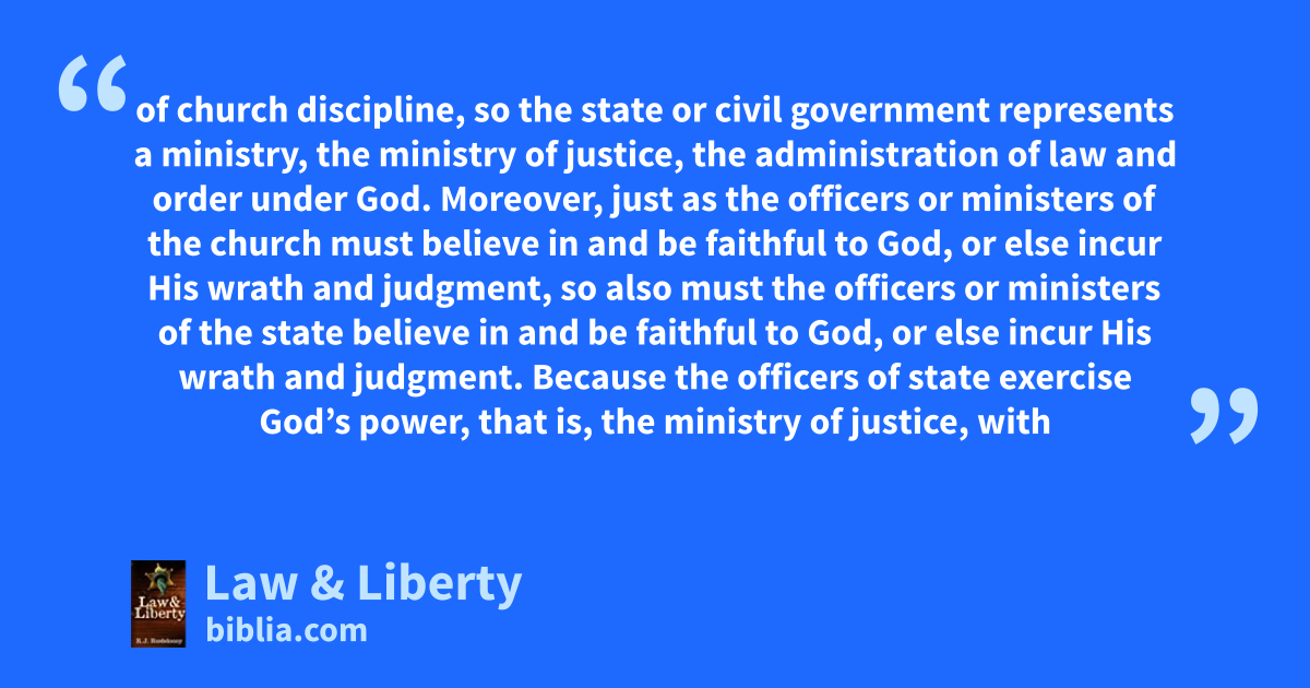 of church discipline, so the state or civil government represents a ministry, the ministry of justice, the administration of law and order under God. Moreover, just as the officers or ministers of the church must believe in and be faithful to God, or else incur His wrath and judgment, so also must the officers or ministers of the state believe in and be faithful to God, or else incur His wrath and judgment. Because the officers of state exercise God’s power, that is, the ministry of justice, with