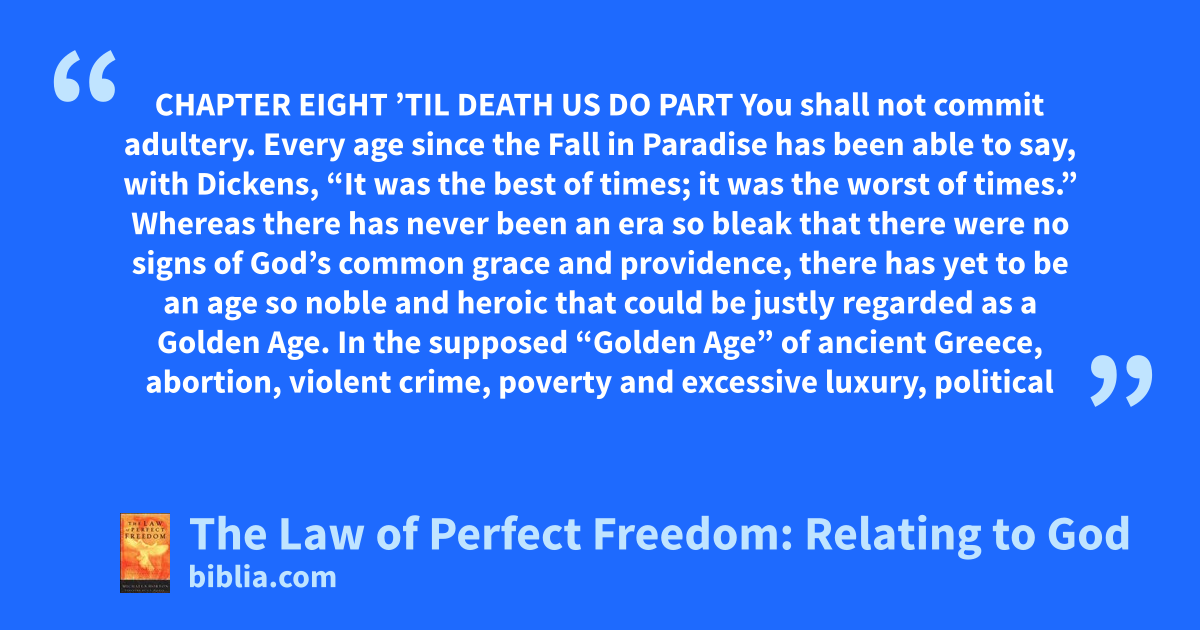 CHAPTER EIGHT ’TIL DEATH US DO PART You shall not commit adultery. Every age since the Fall in Paradise has been able to say, with Dickens, “It was the best of times; it was the worst of times.” Whereas there has never been an era so bleak that there were no signs of God’s common grace and providence, there has yet to be an age so noble and heroic that could be justly regarded as a Golden Age. In the supposed “Golden Age” of ancient Greece, abortion, violent crime, poverty and excessive luxury, political