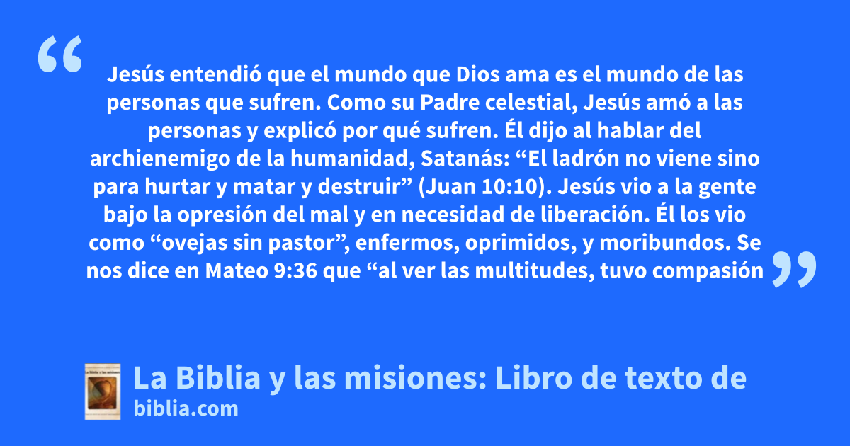 Jesús entendió que el mundo que Dios ama es el mundo de las personas que sufren. Como su Padre celestial, Jesús amó a las personas y explicó por qué sufren. Él dijo al hablar del archienemigo de la humanidad, Satanás: “El ladrón no viene sino para hurtar y matar y destruir” (Juan 10:10). Jesús vio a la gente bajo la opresión del mal y en necesidad de liberación. Él los vio como “ovejas sin pastor”, enfermos, oprimidos, y moribundos. Se nos dice en Mateo 9:36 que “al ver las multitudes, tuvo compasión