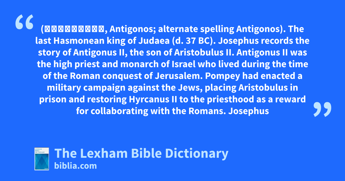Antigonus, Son of Aristobulus II (Ἀντίγονος, Antigonos; alternate spelling Antigonos). The last Hasmonean king of Judaea (d. 37 bc).