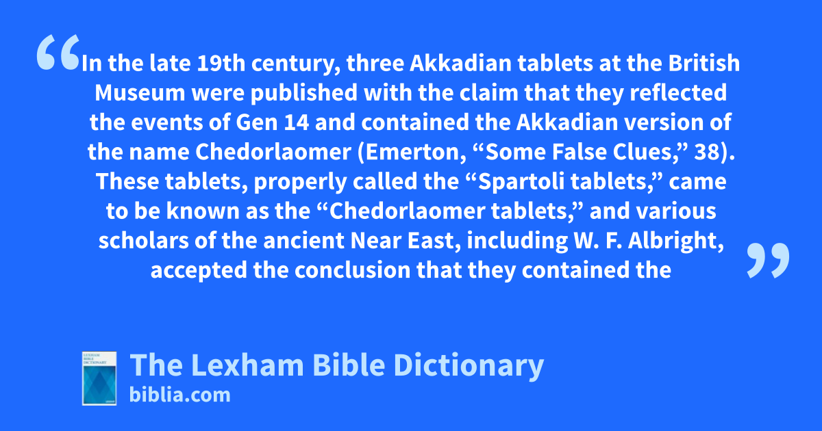 In the late 19th century, three Akkadian tablets at the British Museum were published with the claim that they reflected the events of Gen 14 and contained the Akkadian version of the name Chedorlaomer (Emerton, “Some False Clues,” 38). These tablets, properly called the “Spartoli tablets,” came to be known as the “Chedorlaomer tablets,” and various scholars of the ancient Near East, including W. F. Albright, accepted the conclusion that they contained the Elamite name Kudur-Lagamar (Albright, “Third Revision,” 33; Greunthaner, “Date Part 2,” 85). Later evidence has produced the names of over 40 Elamite kings who reigned between 2100 and 1100 bc “and there is no Kudur-Lagamar among them” (Albright, “Third Revision,” 33; see also Hamilton, Genesis, 399).