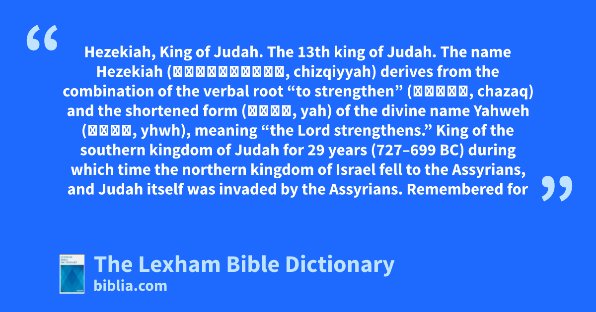 Hezekiah, King of Judah Hezekiah, King of Judah. The 13th king of Judah. The name Hezekiah (חִזְקִיָּה, chizqiyyah) derives from the combination of the verbal root “to strengthen” (חָזַק, chazaq) and the shortened form (יָּה, yah) of the divine name Yahweh (יהוה, yhwh), meaning “the Lord strengthens.” King of the southern kingdom of Judah for 29 years (727–699 bc) during which time the northern kingdom of Israel fell to the Assyrians, and Judah itself was invaded by the Assyrians. Remembered for his religious reforms (2 Kgs 18:4; 2 Chr 29:3–36), for breaking allegiance with Assyria in favor of an alliance with Egypt (2 Kgs 18:13–16; Isa 30; 31; 36:6–9), and for his illness and miraculous recovery (2 Kgs 20; 2 Chr 32; Isa 38).