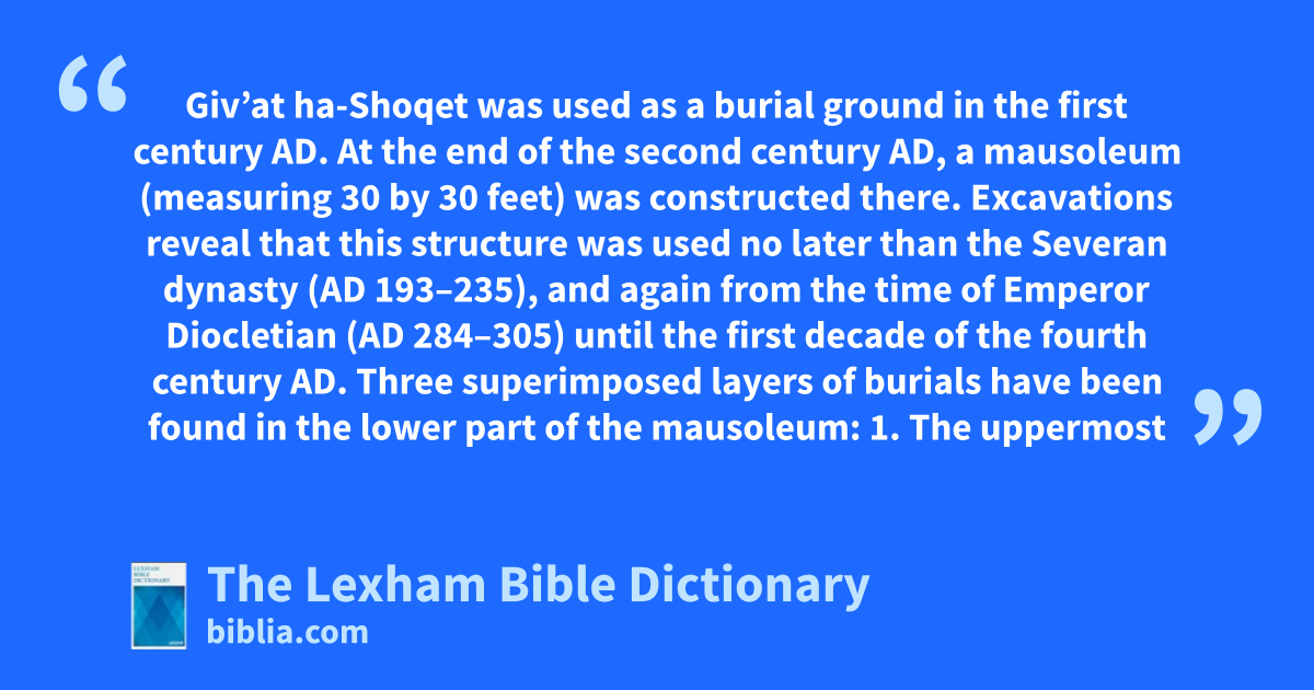 Giv’at ha-Shoqet was used as a burial ground in the first century ad. At the end of the second century ad, a mausoleum (measuring 30 by 30 feet) was constructed there. Excavations reveal that this structure was used no later than the Severan dynasty (ad 193–235), and again from the time of Emperor Diocletian (ad 284–305) until the first decade of the fourth century ad. Three superimposed layers of burials have been found in the lower part of the mausoleum: