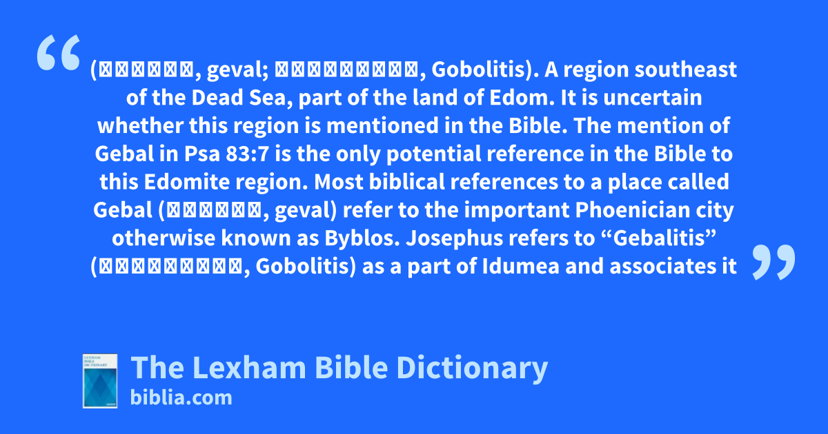 Gebal, Region (גְּבָל, geval; Γοβολῖτις, Gobolitis). A region southeast of the Dead Sea, part of the land of Edom. It is uncertain whether this region is mentioned in the Bible. The mention of Gebal in Psa 83:7 is the only potential reference in the Bible to this Edomite region. Most biblical references to a place called Gebal (גְּבַל, geval) refer to the important Phoenician city otherwise known as Byblos. Josephus refers to “Gebalitis” (Γοβολῖτις, Gobolitis) as a part of Idumea and associates it with Amalekites (Antiquities, 2.6). He also mentions “Gebalites” along with Amalekites and Edomites in his account of Amaziah’s campaign against the Edomites (Antiquities, 9.188–192; compare 2 Kgs 14:7). Psalm 83:7 is thought to refer to this region of the Transjordan because it is named in association with Edom, Moab, Ammon, and Amalek, all areas of the Transjordan. The references to Gebal in Josephus also link it to Edom and Amalek. The variant Hebrew spelling of the place in Psa 83:7, slightly different from the spelling of the Phoenician city, is also a possible indication that a different location was meant. However, Psalm 83:7 continues with references to a number of Israel’s other enemies, including the Phoenician city of Tyre. Therefore, the reference to Gebal in Psa 83:7 could potentially also be the Phoenician city. For further information, see this article: Gebal.