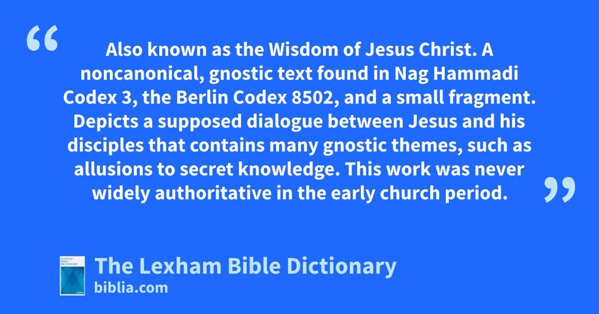 Sophia of Jesus Christ Also known as the Wisdom of Jesus Christ. A noncanonical, gnostic text found in Nag Hammadi Codex 3, the Berlin Codex 8502, and a small fragment. Depicts a supposed dialogue between Jesus and his disciples that contains many gnostic themes, such as allusions to secret knowledge. This work was never widely authoritative in the early church period.