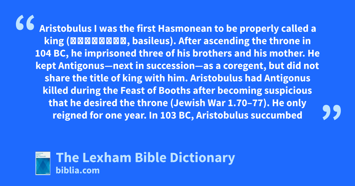 Aristobulus I (104–103 bc). Aristobulus I was the first Hasmonean to be properly called a king (βασιλεύς, basileus). After ascending the throne in 104 bc, he imprisoned three of his brothers and his mother. He kept Antigonus—next in succession—as a coregent, but did not share the title of king with him. Aristobulus had Antigonus killed during the Feast of Booths after becoming suspicious that he desired the throne (Jewish War 1.70–77). He only reigned for one year. In 103 bc, Aristobulus succumbed to an illness, which he understood as God’s punishment for his fratricide (Jewish War 1.84).