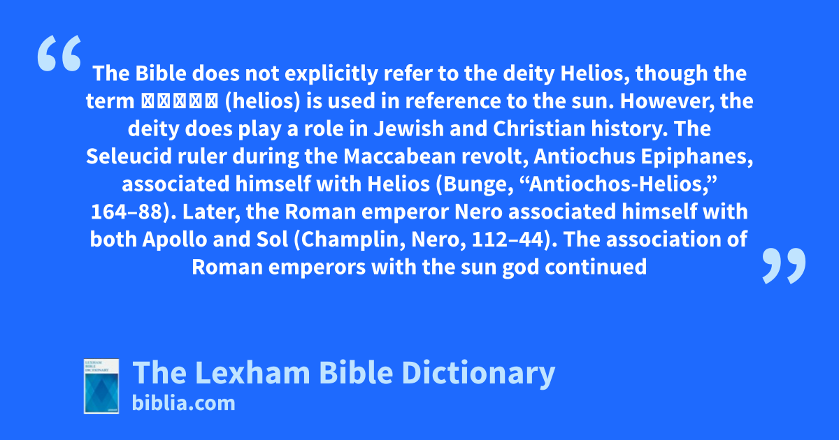 The Bible does not explicitly refer to the deity Helios, though the term ἕλιος (helios) is used in reference to the sun. However, the deity does play a role in Jewish and Christian history. The Seleucid ruler during the Maccabean revolt, Antiochus Epiphanes, associated himself with Helios (Bunge, “Antiochos-Helios,” 164–88). Later, the Roman emperor Nero associated himself with both Apollo and Sol (Champlin, Nero, 112–44). The association of Roman emperors with the sun god continued in the cult of Sol Invictus up to Julian the Apostate (d. ad 363). This association was especially pronounced during the reign of Constantine (Preger, “Konstantinos-Helios,” 457–69).