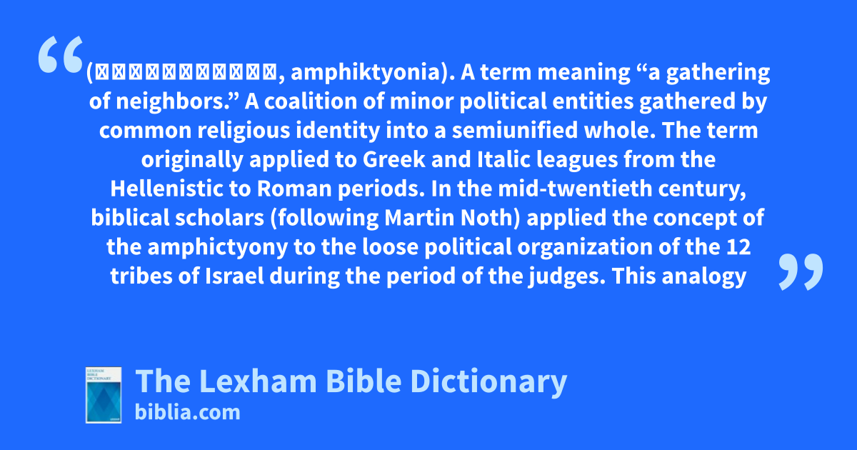 Amphictyony (ἀμφικτυονία, amphiktyonia). A term meaning “a gathering of neighbors.” A coalition of minor political entities gathered by common religious identity into a semiunified whole. The term originally applied to Greek and Italic leagues from the Hellenistic to Roman periods. In the mid-twentieth century, biblical scholars (following Martin Noth) applied the concept of the amphictyony to the loose political organization of the 12 tribes of Israel during the period of the judges. This analogy has been largely abandoned in contemporary biblical scholarship.