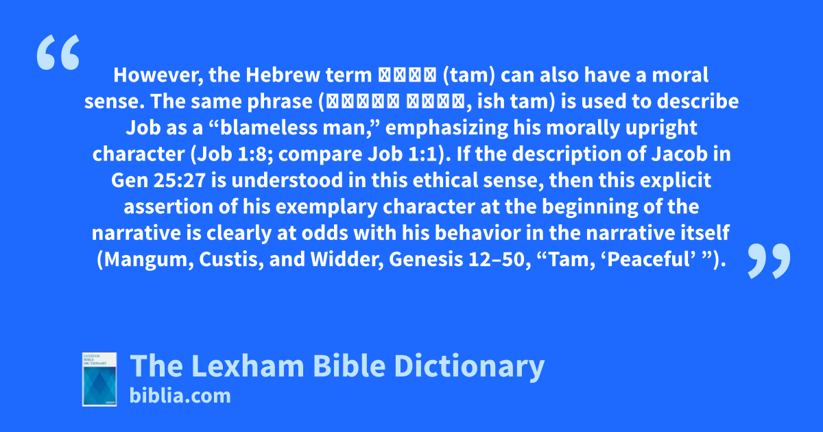 A Quiet Man or a Blameless Man? Genesis 25:27 describes Jacob with a Hebrew phrase often translated as “plain man,” “quiet man,” or “peaceful man” (אִישׁ תָּם, ish tam). However, the Hebrew term תָּם (tam) can also have a moral sense. The same phrase (אִישׁ תָּם, ish tam) is used to describe Job as a “blameless man,” emphasizing his morally upright character (Job 1:8; compare Job 1:1). If the description of Jacob in Gen 25:27 is understood in this ethical sense, then this explicit assertion of his exemplary character at the beginning of the narrative is clearly at odds with his behavior in the narrative itself (Mangum, Custis, and Widder, Genesis 12–50, “Tam, ‘Peaceful’ ”). This disparity with Jacob’s demonstrated character leads many commentators to reject the ethical meaning for this phrase in the case of Jacob (e.g., Waltke, Genesis, 362; Speiser, Genesis, 195). For example, Sarna simply interprets the description as meaning Jacob is “a quiet man and does not carry weapons” (Sarna, Genesis, 181). The Hebrew and Aramaic Lexicon of the Old Testament explicitly notes that the meaning of תָּם (tam) as “complete, perfect” can be applied in physical, social, legal, and moral senses, though the only example it gives for the meaning of “socially perfect” or “civilized” is the usage in question at Gen 25:27 (HALOT, s.v., תָּם, tam).