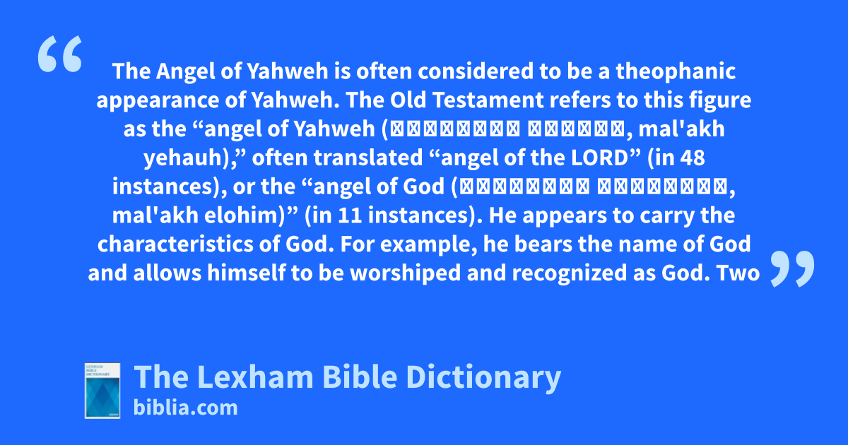 The Angel of Yahweh is often considered to be a theophanic appearance of Yahweh. The Old Testament refers to this figure as the “angel of Yahweh (מַלְאַךְ יְהָוה, mal'akh yehauh),” often translated “angel of the Lord” (in 48 instances), or the “angel of God (מַלְאַךְ אֱלֹהִים, mal'akh elohim)” (in 11 instances). He appears to carry the characteristics of God. For example, he bears the name of God and allows himself to be worshiped and recognized as God.