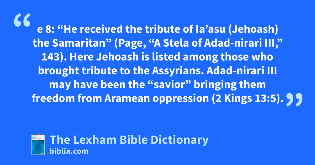 The Rimah Stela, an Assyrian stele of Adad-nirari III, found at Tell al Rimah in 1967, probably mentions Jehoash, son of Jehoahaz in line 8: “He received the tribute of Ia’asu (Jehoash) the Samaritan” (Page, “A Stela of Adad-nirari III,” 143). Here Jehoash is listed among those who brought tribute to the Assyrians. Adad-nirari III may have been the “savior” bringing them freedom from Aramean oppression (2 Kings 13:5).